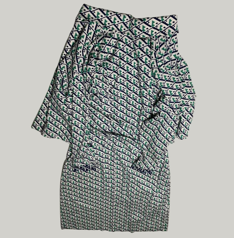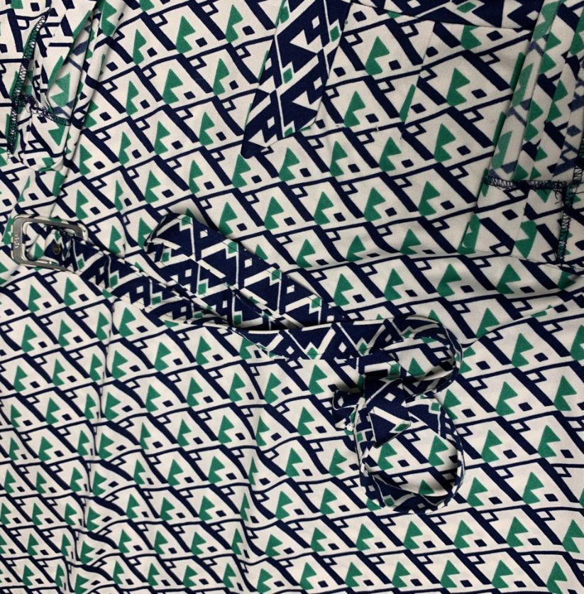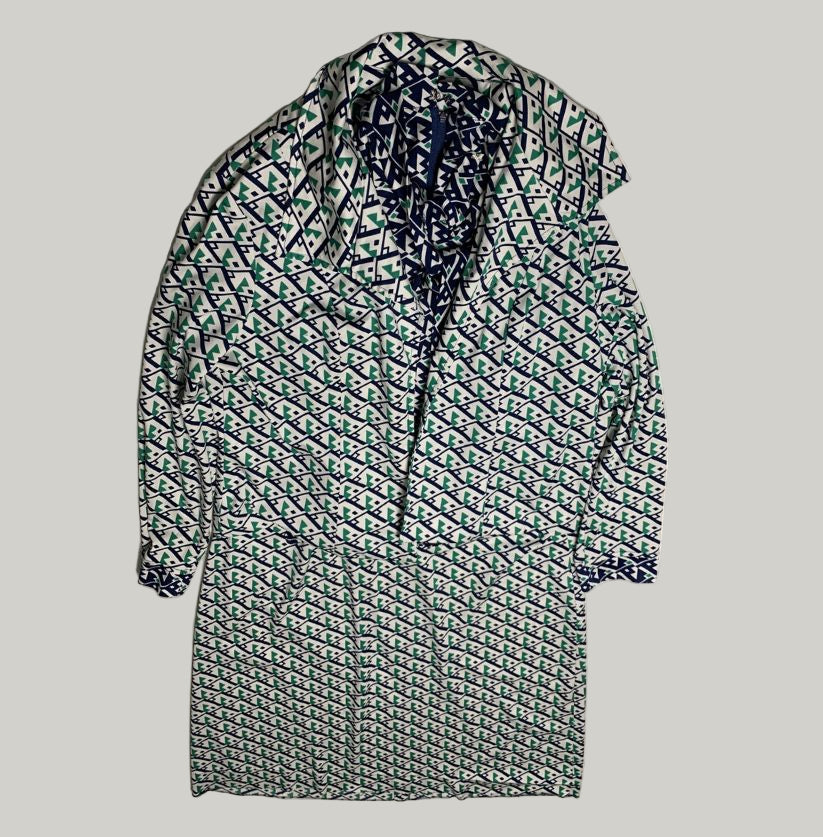 This vintage-inspired long-sleeved dress showcases a bold 1970’s geometric pattern in navy blue, green, and white. It features a high neckline accented with a bow detail and a practical front zip closure. The intricate, all-over print gives the dress a distinctive retro charm, perfect for vintage fashion lovers.