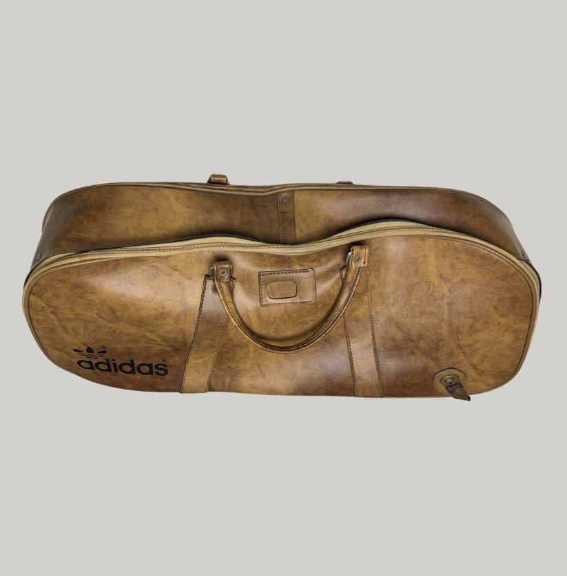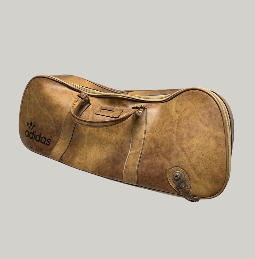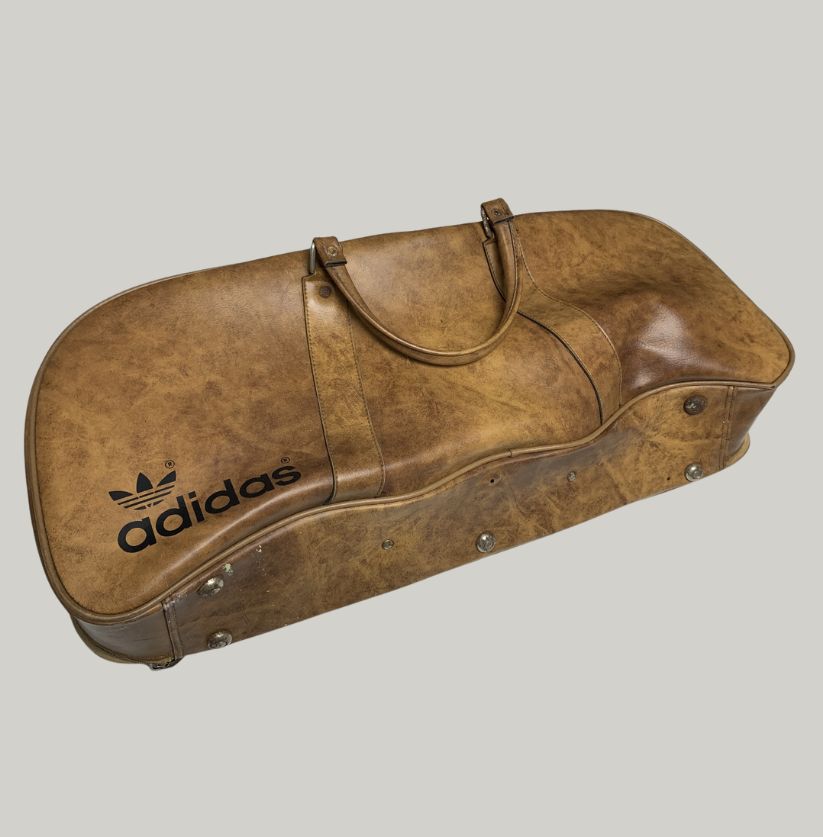 This Adidas leather holdall embodies a vintage athletic-luxury style. Practical yet stylish, the bag has a full-length zipper closure, sturdy handles, and a hard, molded base with metal studs for protection. Ideal as a gym, travel, or weekend bag, this piece carries both functionality and collectible appeal.