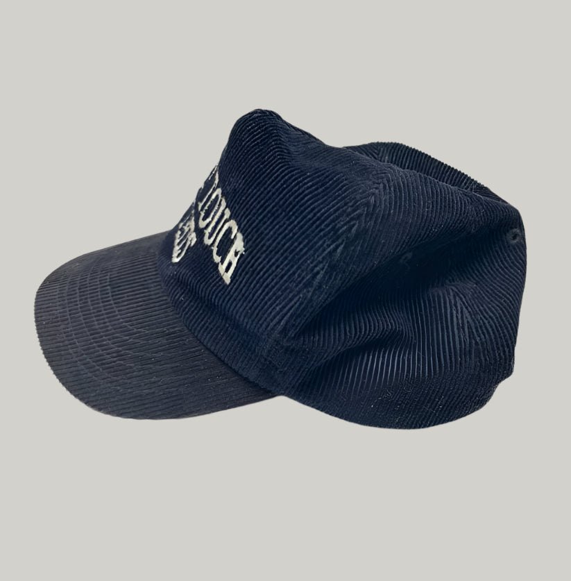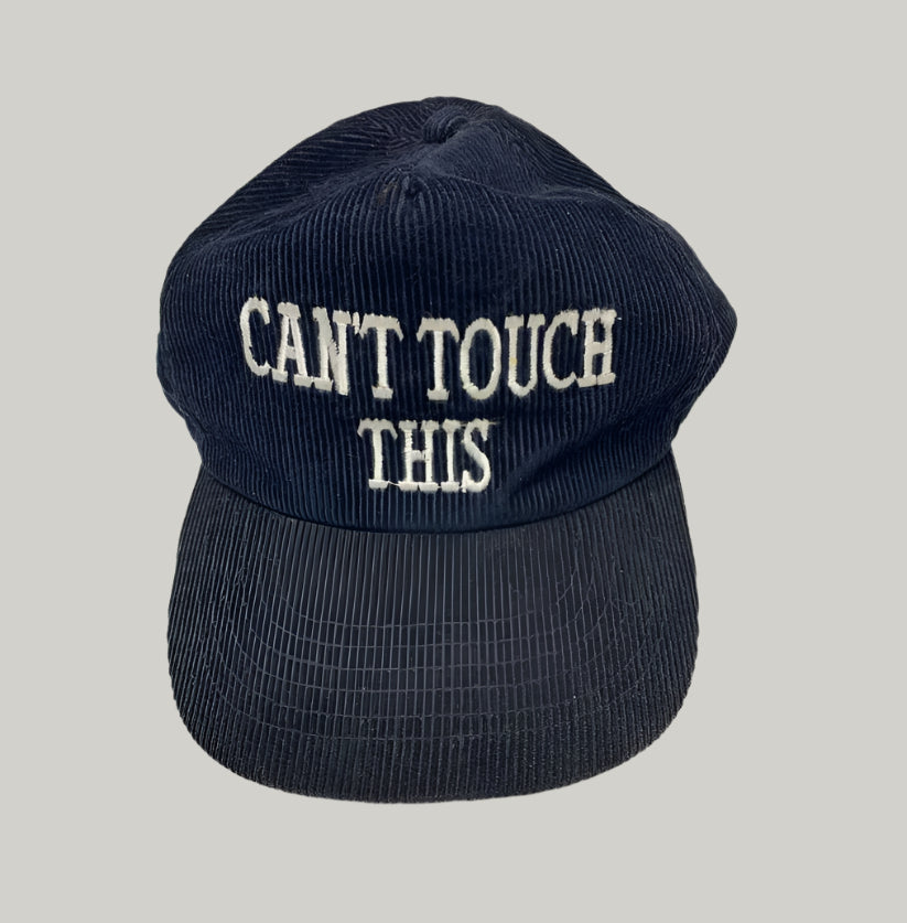 A bold and playful corduroy baseball cap featuring the embroidered phrase “CAN’T TOUCH THIS” in white on the front. Crafted in a rich dark blue or black corduroy fabric, this cap offers a unique texture and classic silhouette with a modern statement.