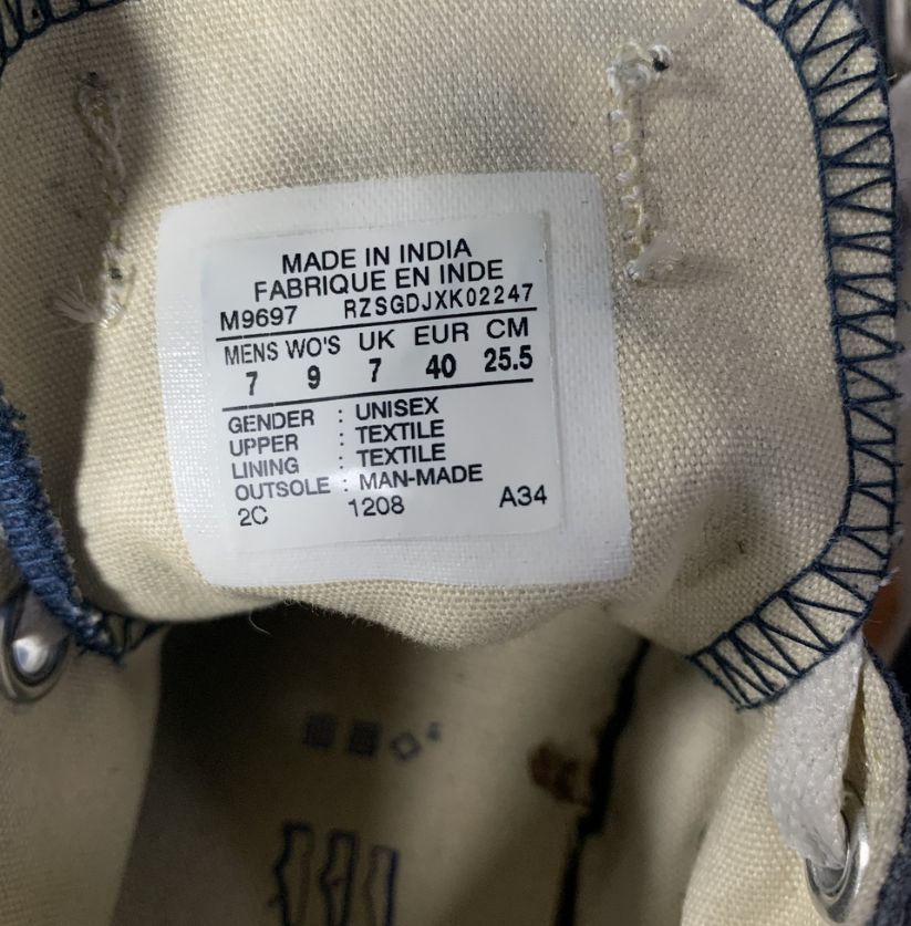 This is a quintessential pair of low-top Converse Chuck Taylor All Star sneakers in a versatile navy blue canvas. The sneakers are in well-loved, pre-owned condition, with visible wear and light distressing on the rubber and canvas.