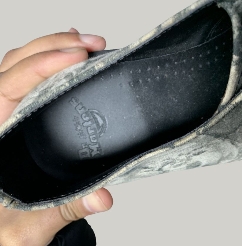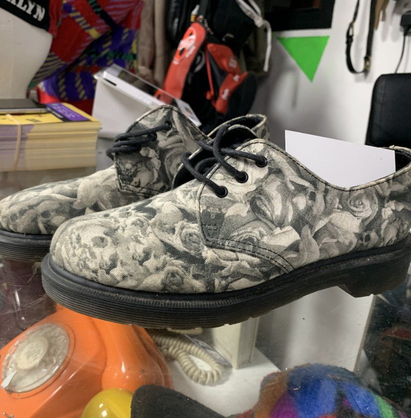 A standout pair of vintage Dr. Martens 1461 low-top shoes featuring a striking monochrome black, white, and grey floral rose print. Crafted in durable canvas. They feature the classic chunky air-cushioned sole, black laces, and the timeless 3-eyelet design.