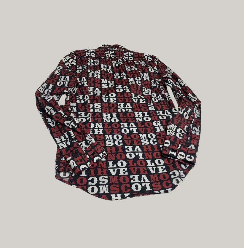 This vintage Love Moschino long-sleeved shirt is a bold statement piece. Designed with a classic button-up front and a standard collar, it perfectly blends playful graphics with timeless tailoring. A standout shirt that reflects Moschino’s signature quirky, fashion-forward aesthetic.