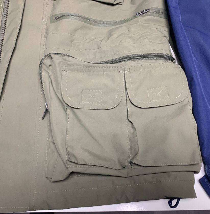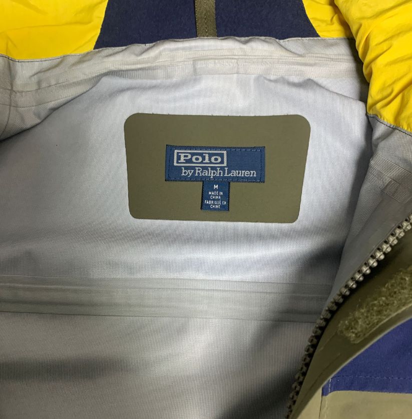 This is a distinctive, multi-pocket technical jacket from Polo by Ralph Lauren. The jacket’s body is crafted in a robust olive green/khaki tone, contrasted by navy blue sleeves and shoulder yoke. It features numerous large flap pockets on the front for both function and style. Additional features include a hidden hood with a bright yellow lining and a secure full zip closure.