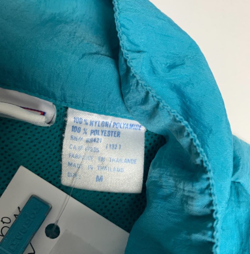 This is a striking vintage 1990s Reebok half-zip pullover windbreaker jacket, crafted in a vibrant teal nylon. The design is elevated with bold abstract brushstroke-style patterns in purple, magenta and yellow across the shoulders and upper sleeves. It features a half-zip front, an embroidered Reebok logo on the chest, and a lightweight mesh lining for breathability.