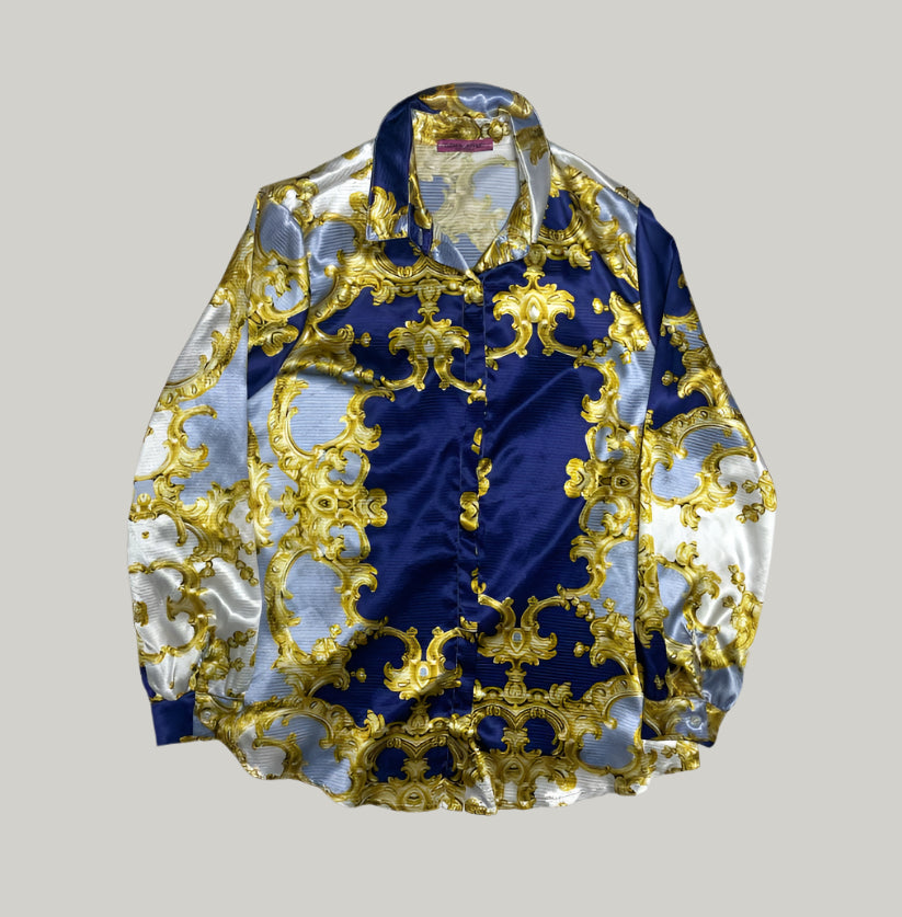 This Tiziana Cervasio blue and gold baroque shirt is a striking vintage piece, featuring an ornate baroque print that exudes luxury and sophistication. With its bold color palette and intricate detailing, this shirt is perfect for those who love statement fashion with a vintage touch.