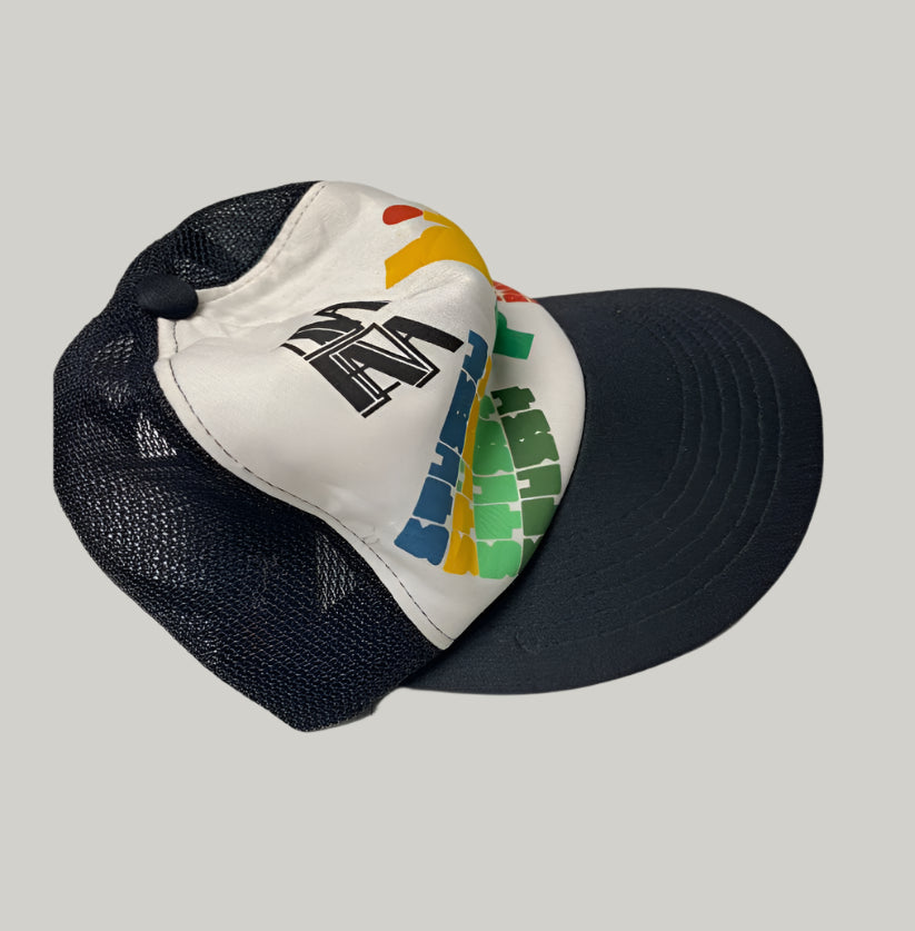 A vintage trucker-style hat featuring a bold and colorful "Top Rank" boxing promotions graphic on the front foam panel. Designed with a classic white front, black mesh back, and matching black curved brim, this hat delivers retro athletic appeal and collectible charm.
