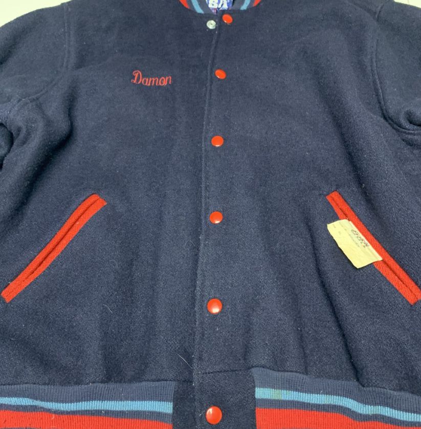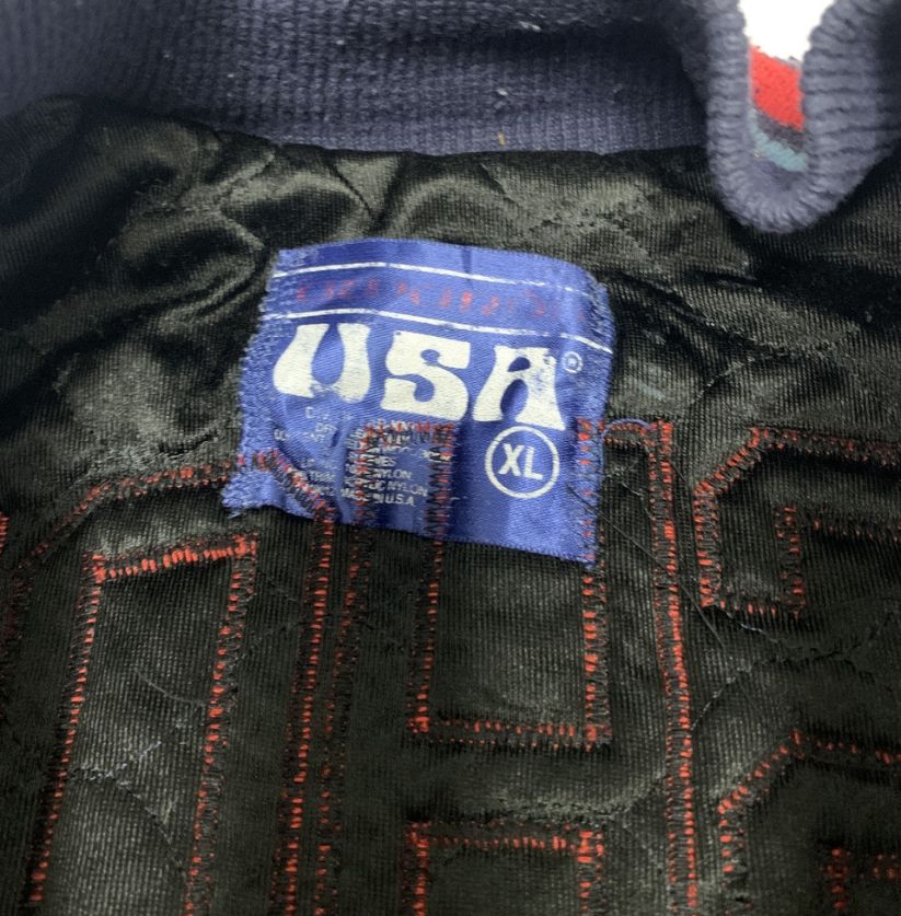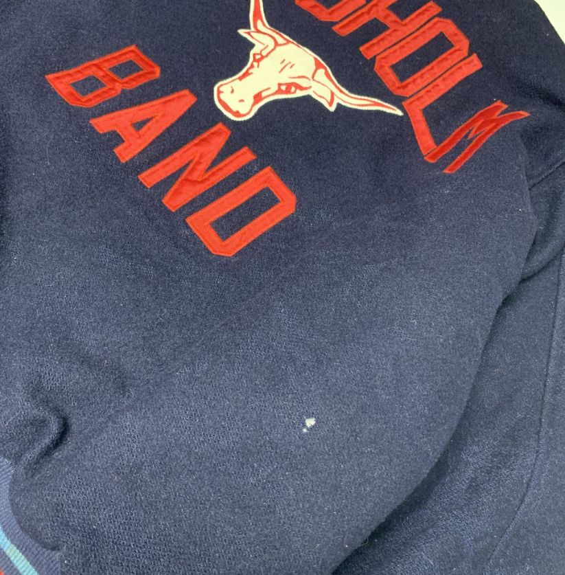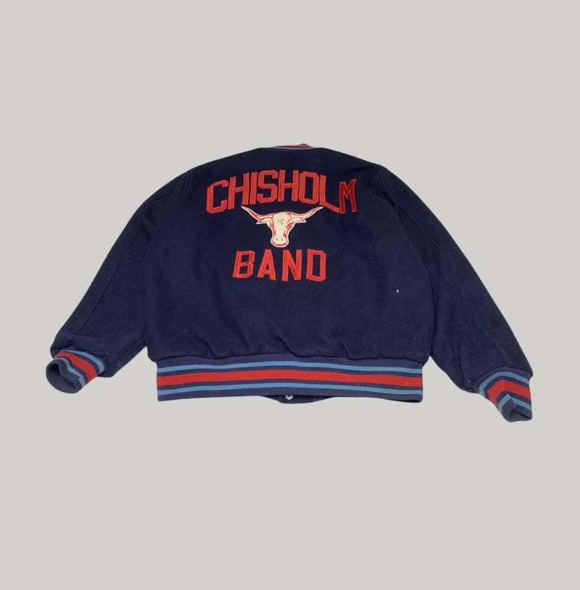 This is a vintage USA Chisholm Band varsity jacket in a rich navy blue color, detailed with bold red and light blue striped ribbed collar, cuffs, and waistband. The jacket features red snap buttons down the front and red-trimmed pockets for a classic varsity look.